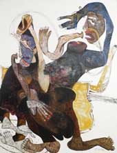 Two other women must be mentioned. Arpita Singh and Jaya Ganguly, with her unsettling images of torn and tortured flesh (picture: Similitude Reconciled). Arpita Singh’s women in Two Women, Two Men, ungainly and unclothed, remain as excruciatingly vulnerable as ever. Ganesh Pyne, Jogen Chowdhury, Manu Parekh and Lalu Prosad Shaw are among the other artists represented.