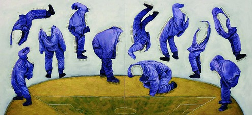 Maimoona Hussain (Maldives) speaks at a more intimate level, evoking the poignant vulnerability of The Female Child, while Sen (India) brings a universal resonance to the experience of disintegration, of "living in bits and pieces", as the integrated ideal symbolized by the Vitruvian Man falls apart. That sense of disintegration persists in Dasgupta, who lives in Nepal. She cunningly wrests from adversity a metaphor for the crisis that followed India's blockade of the land-locked country in 2015 by stitching together bits of canvas when she ran out of art material. And Sunil Sigdel (Nepal) translates a performance into a single, arresting visual which comments on the irony of subcontinental labourers dying - one every two days, says his statement - while building, in blue overalls, the infrastructure in Qatar where the world will compete for the gold in football in 2022. Hence the title, Blue Slavery in Golden Construction (picture, top).