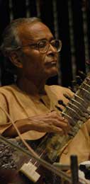 The main item was alap, jod, jhala and gatkari in raga Jaijawanti. Manilal Nag opened up the raga by playing two of its three main phrases right at the beginning. His daughter, Mita, however, reining in the tempo a bit in her first foray, brought in a little slower and more detailed melodic development. Nag seemed to respond and the mode, more or less set by the daughter, tended to prevail throughout the 18-minute alap. His pitch wavered a bit at times in the tar saptak.
