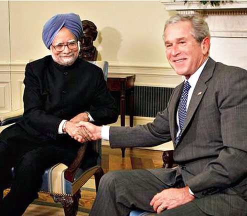 | The US president (right) and the Indian prime minister during the signing of the Indo-US nuclear deal, 2008 |
