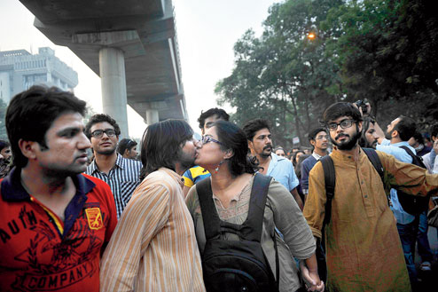 | GOING PUBLIC: Activists and students in Delhi during the Kiss of Love campaign against moral policing |