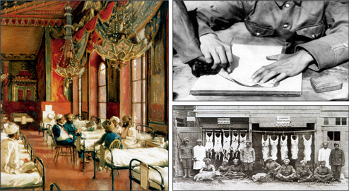 There were other evidences of the Empire’s concern. Separate butchers and abattoirs were provided for making halal meat for Muslim soldiers, non-halal meat for Sikhs, and special ‘uncontaminated’ meat for Hindus. Unfortunately, all these niceties lose their glamour when placed in the overarching narrative of injustice that the war is, an event that kills not the enemy, but humanity. In a photograph that has uncanny reverberations — with the skinned animals foreshadowing the humans who will be stretched on the rack in the Second World War — the consumers enjoy a moment of anticipatory pleasure before they are consumed too in the war machine (bottom right).
