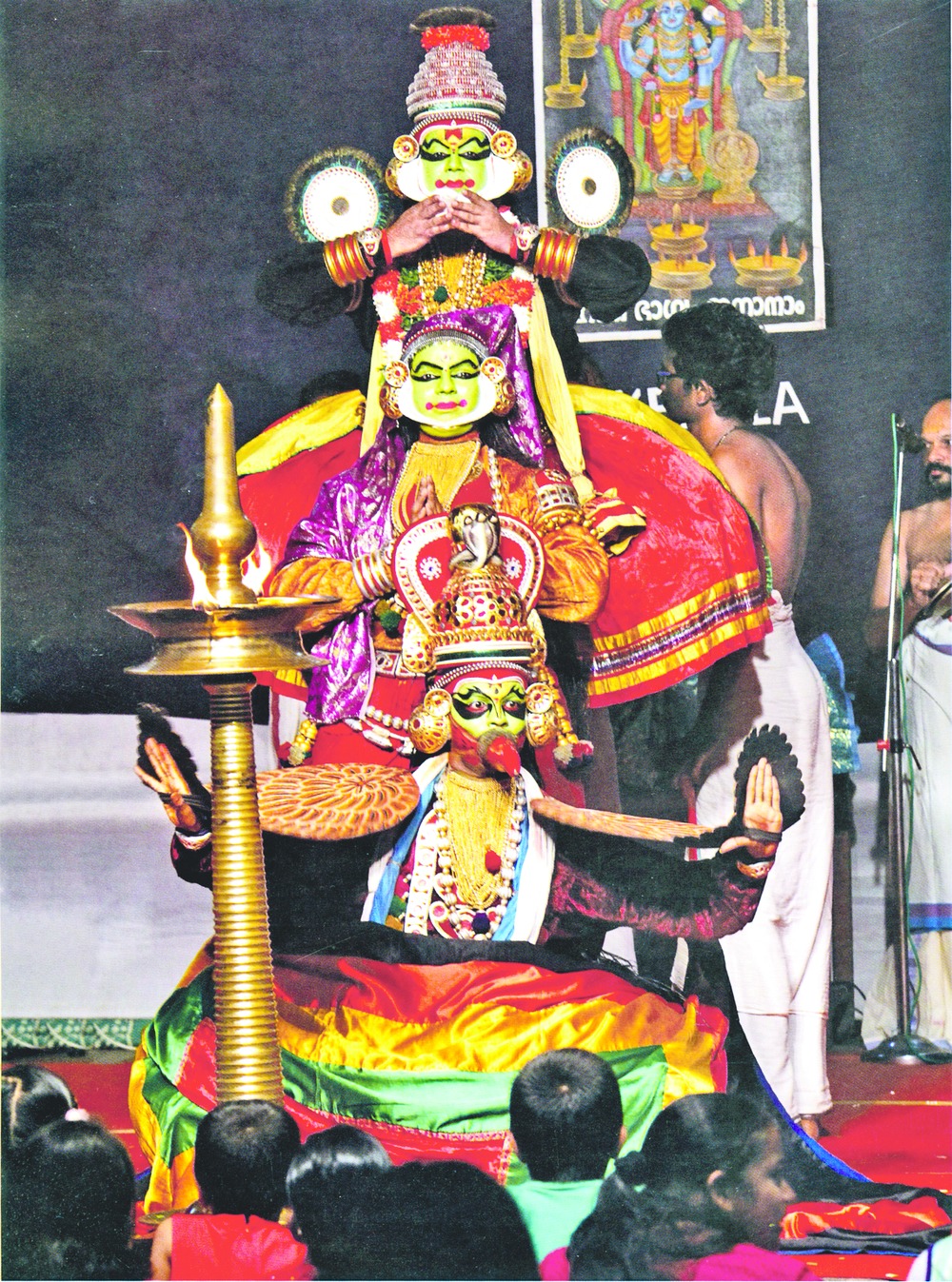 Top shows a Krishnanattam tableau in which the mighty Garuda flies with Krishna and Sathyabhama on his back. Above depicts a typical Theyyam performance (Aakko Chamundi, the goddess of Kamballoore, in a trance at the ancestral home). Theyyam is a ritual dance popular in north Kerala that attaches great importance to the worship of heroes and the spirits of ancestors. Below is a foot position that Kathakali dancers are trained to perfect. Second picture below is a typical sight in a Kathakali green room. Bottommost is a still from a performance of Balivadham, with Kalamandalam Balakrishnan in the role of Bali, Margi Amalraj as Angad (wearing a mask) and Kalamandalam Parthasarathy as Sugreev.