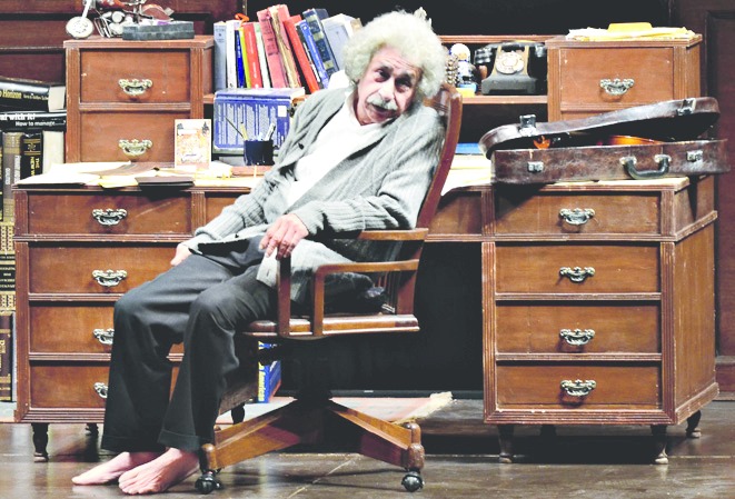 Emanuel's Einstein, at the age of 70, reminisces on key moments of his life and career, certainly educational for those who know nothing about him. Naseeruddin's Method-School style produces a realistic, look-alike portrayal, enhanced by a sustained German-accented English and propped up by Shruti Gupta's chunky wooden set of his cluttered study (a screen for photo projections the only exception). Following the script, he breaks the fourth wall, asking for spectator volunteers to illustrate how gravity bends space, simultaneously flirting with the lady, "You remind me of my first wife." But the show is in fact highly serious, repeating the pacifist Einstein's abhorrence for the application of his theories into atom bombs, and ends with an image of the Marshall Islands mushroom cloud of 1954.