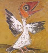 The reference to the ambient noises that intrude into our lives continues: the rich in idle chatter on the cellphone; an underclad singer singing passionately into a microphone; a Fledgling bird (picture), with its suggestion of beating wings and tentative squeaks. Indeed, many of the characters have their mouths open and teeth exposed. But not the artist himself who is present, like always, in several self-portraits.