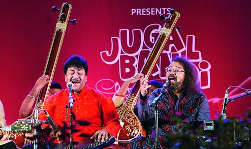 In the second phase of the programme, both the artists graced the stage and chose the Raga Puriya Dhanashree to perform together. This was a spontaneous zone for Rashid; Hariharan, too, gave his best in creating a serious atmosphere of Indian classical music. From the beginning of the aochaar they tried to bring out the quintessence of this melodious evening raga, and both the artists gave enough space and time to each other to allow the performance to bloom. Rashid went into the depth of the raga to create a charm with sparkling vistaars and taans in the three octaves, while Hariharan made a sincere effort to coordinate with his originality, especially in the middle and upper octaves. Rashid was more melliflous, on account of his core expertise in this genre, but Hariharan, too, portrayed a different side of the raga. They presented the common compositions in vilambit and drut kheyal, and both the compositions were filled with an altogether different musical resonance.
