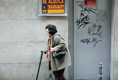 | A woman walks past a business establishment in Madrid that has shut down |