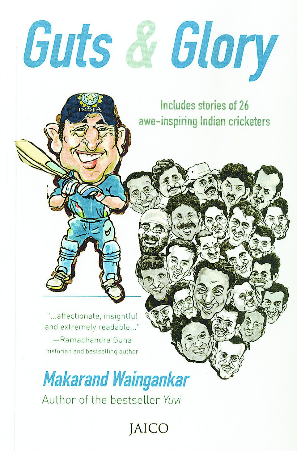 GUTS & GLORY: INCLUDES STORIES OF 26 AWE-INSPIRING INDIAN CRICKETERS (Jaico, Rs 299) by Makarand Waingankar chronicles the story of Indian cricket in the process of giving an account of the professional lives of the cricketers it surveys. Penned by a keen observer of the game, with rare, old-fashioned wit, Guts & Glory will transport readers to days like the one in which Mansur Ali Khan Pataudi, even with an injured leg, had hammered legendary Australian quickies, Graham McKenzie and Neil Hawke. Rich with anecdotes, the book takes the reader on a journey through the last four decades of Indian cricket. The author reminisces about the legends of Indian cricket both past and present. The inimitable caricatures by Austin Coutinho adds to the pleasures of reading this book.