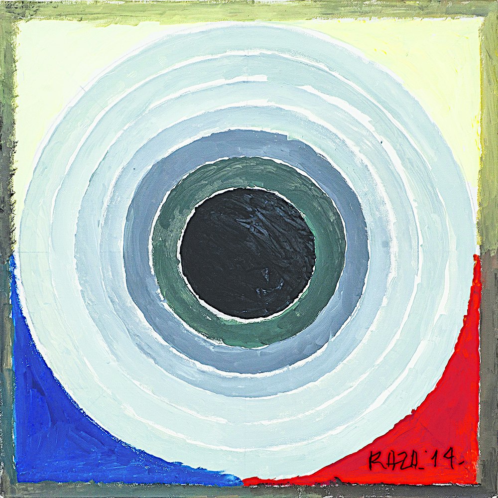 Few Indian artists have understood and exploited, as Raza has, the physical sensation of colours and the subtle spell their inter-relations yield. It's not just the counterpoint of black or blues to reds, oranges and yellows that's often seen in his works, but also the sensuous earth tones, the barely-differentiated browns, the calming greys, the spectrum of blues that, imbued with the delicate nuances of a mystical light, radiate a range of suggestions. Tiryak, dated 2011 but included in this show, is an example of how a vertically-stacked arrangement of greys and black in bands, orbs and triangles is gravely meditative, and seems to absorb disquiet in a kind of final resolution. From 2014 comes Avarta, whose concentric circles, again in greys, referring to his amazing Shanti Bindus, speaks of a cooling off, as though all the heat of his earlier Bindu Vistar has long been released and a slowing down has begun.