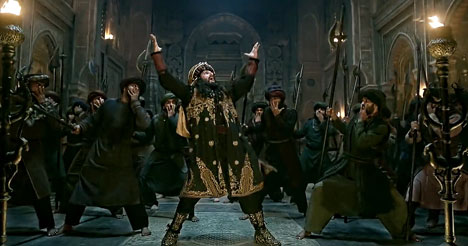Therefore, when you are presented with the weird and uncanny song-and-dance sequence, Khalibali ho gaya hai dil..., you gladly slip into the role of subject. Cinema takes grip of your senses and you take cognisance of Khilji's thundering presence. You train your eyes only on him as he suggestively brushes his square hands on his flowing hair and beard, fingers adorned with giant gems, as if to convey excess. The catchy music and rows of extras stomping their feet in unison are effective boosters. Khilji then challenges you with his act of repeatedly slapping his thigh looking directly into the camera all the while, and slowly turning around.