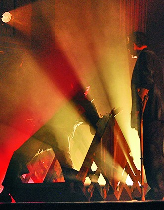 Chattopadhyay places a curiously named Goutam Islam (Ujjal Malakar) amid all this. Goutam loves his beef kebab from Nizam's and, like everybody else, is continually harassed by the system. He cannot even trust Lopamudra (Shubhannita Guha), his rebellious love interest. Ritwik Majumdar, the ideological opposition, reminds one of Ritwik Ghatak and Charu Majumdar. Baburam Sapure's flute finds a home in Chaturvedi Antique Shop. Without naming it, Chattopadhyay conceives Room No. 101, the torture chamber, after the Jantar Mantar Ghar à la Goopy Gyne Bagha Byne, with light-bulb filaments underlining the shock therapy and textured top lights creating psychometric patterns on the stage floor. Video projections were used extensively, including a snippet from the 1963 Bob Dylan concert where he sings, "Blowing in the Wind", alongside Joan Baez. Towards the end, Chattopadhyay introduces live CCTV footage when the protagonist faces a trial downstage and the camera projects the audience reaction on the cyclorama. Light designer Dinesh Poddar delivers them all and Shreyan Chattopadhyay designs a raucous soundtrack that plays on the nerves. The actors happily fitted into the directorial vision.