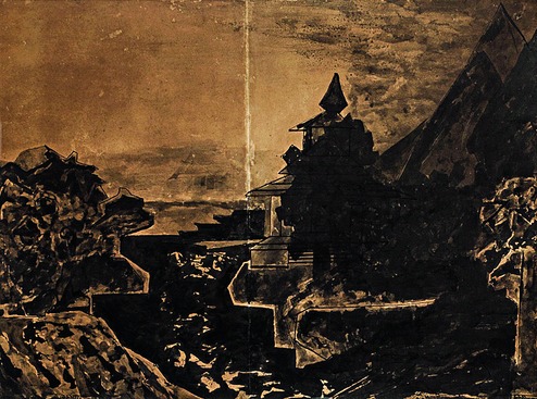 The most outstanding work was Rabindranath's rather large The Ruined Buddhist Monastery done with ink and brush. An atmospheric work, the silhouette of the temple spire rises above the clumps of dark trees. Two pen-and-ink drawings, one of a seated woman with an elongated torso and another of a bright-eyed man with a Pinocchio-like nose, were close to his doodles. The autographed catalogue of his 1932 exhibition at what was then the Government School of Art lists prices of some of his works, the highest being Rs 1,250 - not bad for those times.