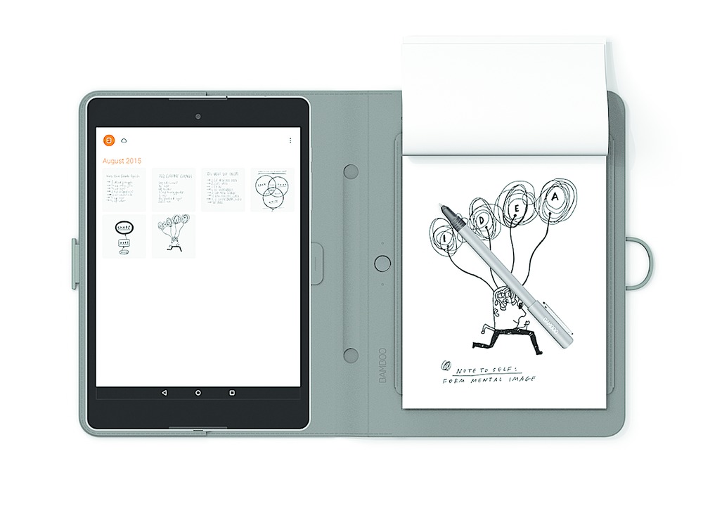 The Bamboo Spark is a smart folio, much like an iPad case, that syncs with your phone or tablet. The folio comprises an electromagnetic resonance sensor, a ballpoint pen with a transmitter, and a pad of regular paper. You write or draw on real paper with the smart pen and a digital copy of your notes is sent to your mobile device via Bluetooth. All this is done seamlessly.