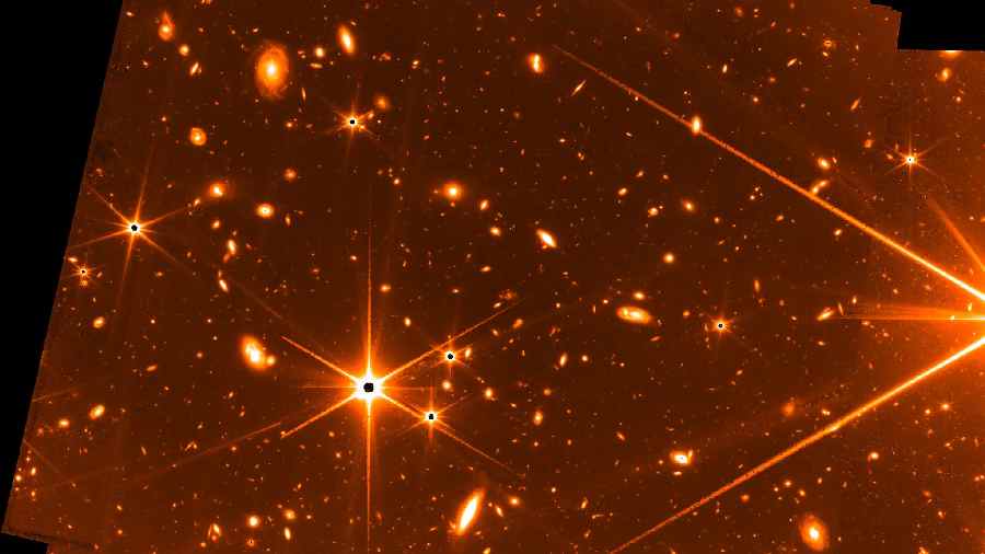 Stars and galaxies captured by the James Webb Space Telescope using its Fine Guidance Sensor, which helps the telescope ensure precision when it aims at its targets. Webb scientists said this test image, made up of 72 exposures over 32 hours, was one of the deepest images of the universe ever taken.