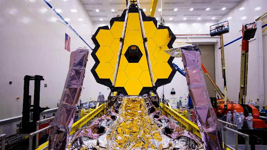 In an undated image provided by Northrop Grumman, work was performed on the James Webb Space Telescope at Northrop Grumman in California in April 2020. The largest space telescope ever built is ready to show us what it’s been looking at for the past six months.