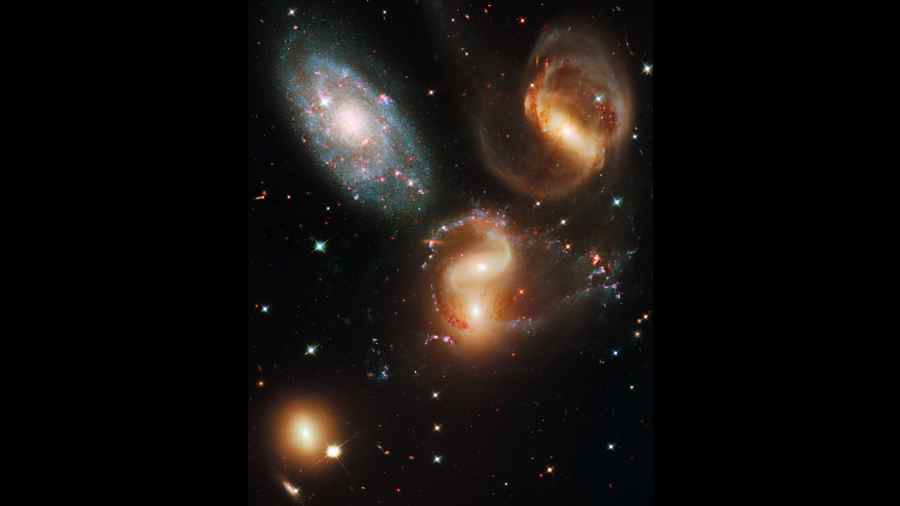 Sparkly spiders. Stephan’s Quintet, one of the first compact galaxy groups ever observed, in 1877, is 290 million light-years away. The bluish galaxy in the foreground is only 40 million light-years away.