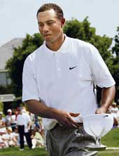 | Tiger Woods walks off the 18th green at the Byron Nelson championship in Irving on Friday. (Reuters) |