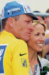 | Lance Armstrong, wearing the leader’s yellow jersey, and pop singer Sheryl Crow after the Discovery Channel team won the fourth stage team time trial on Tuesday. (Reuters) |