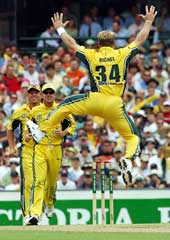 Lee got openers Marcus Trescothick (0) and Nick Knight (5) on catches to Gilchrist.Williams got rid of Nasser Hussain (1) when the England captain played on and then had Alec Stewart (12) caught behind. Bichel struck twice in one over, trapping Michael Vaughan (21) leg-before and then having Ian Blackwell (0) caught by Ricky Ponting at second slip. Lee returned to dismiss Ronnie Irani (10).