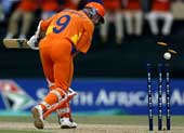 | Edgar Schiferli of Holland is bowled by Ian Harvey in Potchefstroom Thursday. Australia won by 75 runs. (Reuters) |