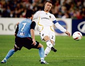| David Beckham, who scored with a typical curling free-kick against Sydney FC, in action on Tuesday. LA Galaxy lost 3-5. (AP) |
