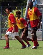 | East Bengal captain Bhaichung Bhutia practises with teammates Syed Rahim Nabi and Martial at the Howrah Municipal Stadium on Friday. Picture by Santosh Ghosh |