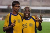 | George Telegraph scorers Gour Naskar (left) and Saheed Olowo after their win against East Bengal at the Salt Lake Stadium on Thursday. A Telegraph picture |