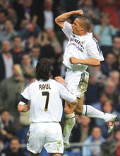| Real Madrid?s Roberto Carlos celebrates his goal against Malaga with Raul at the Santiago Bernabeu in Madrid on Sunday. (AFP) |