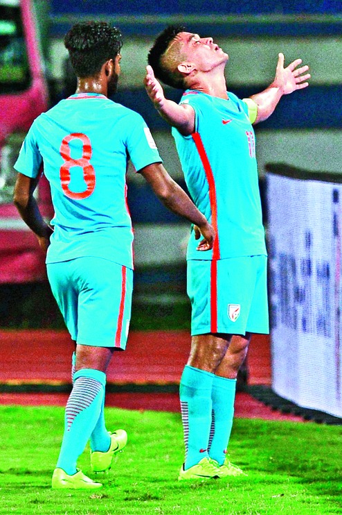 Chetri drilled a low right footer off a fine Jeje Lalpekhlua pass in the 69th minute to lead India to a crucial win in the home leg tie of the Group A third-round qualifiers.