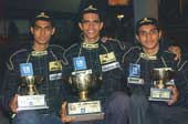 | The senior category top three ? champion Rayomand Banajee (centre), runner-up Sudarshan K. Rao (left) and third finisher Kartik Shankar ? with their National Karting Championships Calcutta leg trophies on Sunday. Picture by Sanjoy Chattopadhyaya |