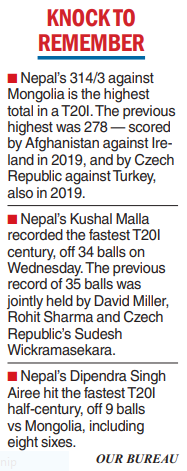 Batting at No. 3, Malla smashed 12 sixes and eight fours to remain unbeaten on 137 and power Nepal to the highest-ever T20I total of 314/3 against Mongolia, who opted to field.