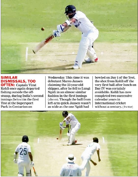 On several occasions before this Test, Kohli had been dismissed fishing outside the off-stump. His mode of dismissal in Centurion too was similar as on Wednesday. It was debutant Marco Jansen’s turn to make him edge one outside the off-stump, after Lungi Ngidi did so on Day I.