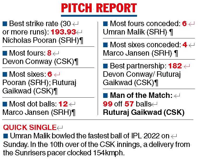 Gaikwad’s 57-ball 99 and Conway’s unbeaten 85 off 55 balls powered Chennai to 202 for 2 after they were put in to bat. Even though Chennai’s bowling has been one of their concerns this season, chasing the target was still a tall order for the Sunrisers.