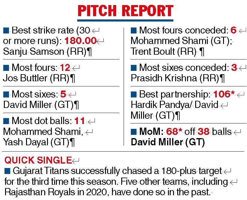 Captain Hardik Pandya (40 not out) and David Miller (68 not out)’s unbeaten 106-run partnership led Gujarat Titans to an impressive and clinical seven-wicket win over Rajasthan Royals in Tuesday’s Qualifier I at a packed Eden Gardens.