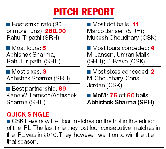After losing to Kolkata Knight Riders, newcomers Lucknow Super Giants and Punjab Kings, Chennai were given a pasting by Sunrisers Hyderabad who thrashed them by eight wickets at the DY Patil Stadium in Navi Mumbai.