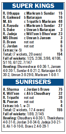 The Sunrisers too were yet to be off the mark going into this game. But since winning the toss and opting to bowl first, they got their execution right in most cases and restricted the Super Kings to a modest total of 154 for 7 first up. Thereafter, under-pressure opener Abhishek Sharma stood up and delivered with a solid, compact 50-ball 75 that made the run chase easier for the Sunrisers as they eventually strolled home with 14 balls remaining and opened their account.