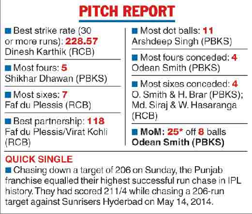 But fortunately for Punjab Kings, Odean Smith (25 not out off 8 balls) lived up to his reputation as a power-hitter down the order. Smith clobbered Siraj in the 18th over that fetched Punjab Kings as many as 25, doing just enough to seal them the game, which they eventually won with an over to spare.