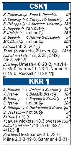 The Knight Riders had a rather settled line-up and even the absence of Aaron Finch, Pat Cummins and Tim Southee had no effect. The bowling was spot on from the moment Umesh Yadav dismissed Ruturaj Gaikwad with the third delivery of the match.