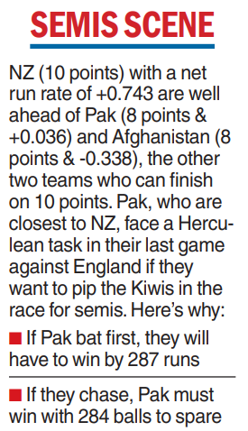 New Zealand have a positive net run rate of 0.743, while Pakistan have 0.036. The Afghans are further below with a negative net run rate of -0.338. Therefore, Pakistan and Afghanistan face almost impossible equations to push their net run rate above New Zealand’s. For example, Afghanistan must beat South Africa by at least 438 runs, or Pakistan, suppose they bat second after restricting England to 150, must chase down the target inside four overs.