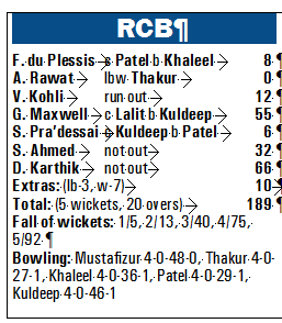 Asked to bat first, RCB were wobbling at 40 for 3 in the seventh over with captain Faf du Plessis and Virat Kohli, who was run out off a brilliant direct hit from Lalit Yadav, back in the dugout. But valuable contributions from Maxwell (55 off 34 balls) and Karthik’s late flourish (66 not out off 34 balls) powered RCB to 189 for 5, which didn’t look possible at all at the halfway stage of their innings.