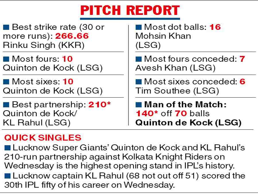 Earlier, dropped on 12 by debutant Abhijeet Tomar in the third over of the game off Umesh, De Kock made the most of the let off. And with captain Rahul turning out to be the South Africa wicketkeeper-batsman’s perfect foil, the duo powered Lucknow past 200. Ten fours and as many sixes adorned De Kock’s superlative knock, while Rahul had no problem in playing second fiddle.