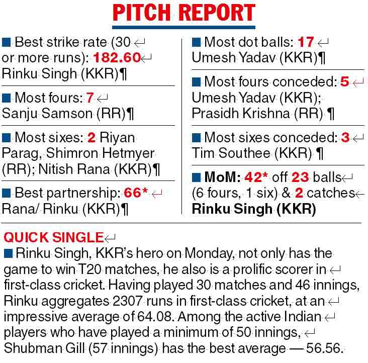 The Kolkata Knight Riders’ tinkering with their team combination continued. But a collective effort from the bowlers followed by an unbroken 66-run stand by Nitish Rana (48 not out) and Rinku Singh (42 not out) ensured the result went in the Knights’ favour on this occasion at the Wankhede in Mumbai on Monday.