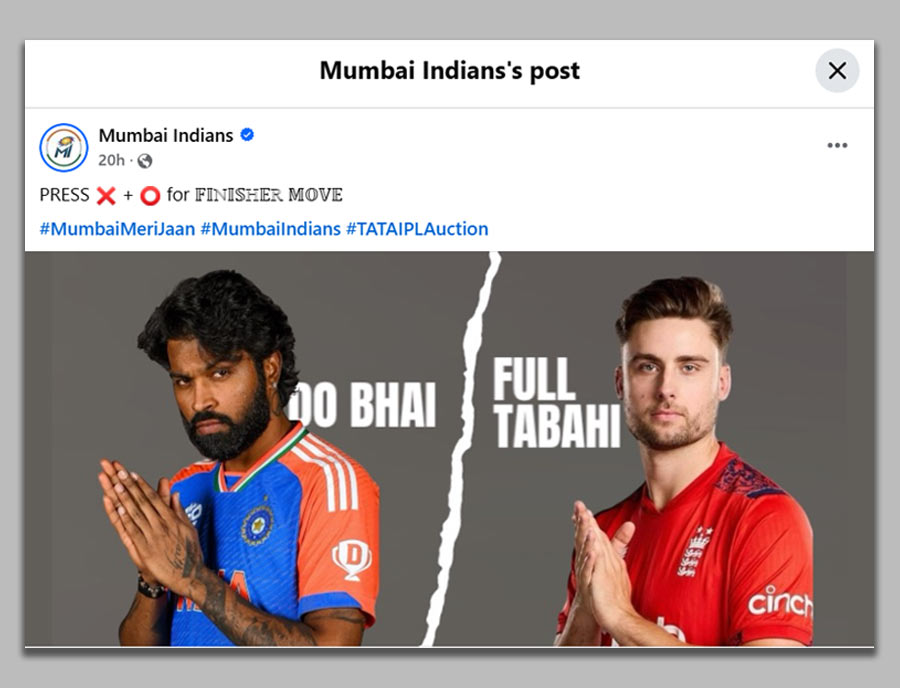 Mumbai Indians didn't just sign Will Jacks – they turned him into a videogame character. Pairing him with Hardik Pandya in a split-screen worthy of Street Fighter, they dropped the ultimate combo move: "PRESS X+O for finisher move." Add a dash of "Do Bhai, Full Tabahi," and boom! Mumbai Indians just won the internet's heart with this perfect marriage of cricket and gaming culture.