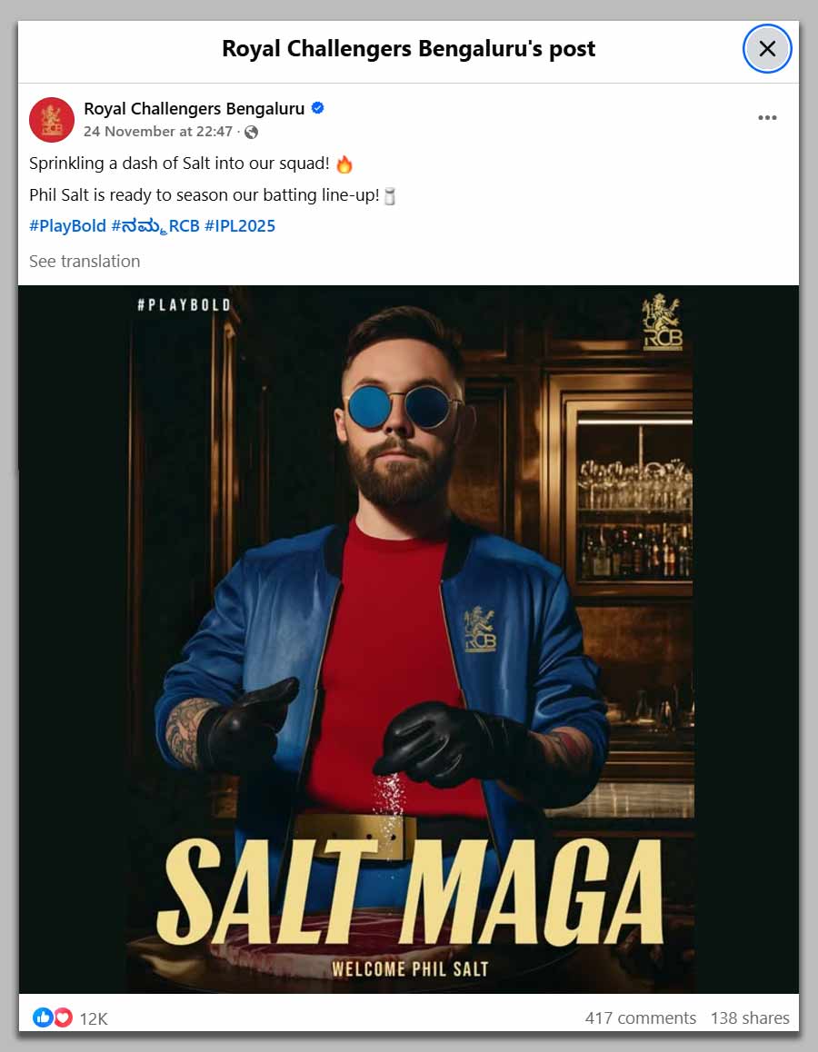 Royal Challengers Bangalore turned their Rs 11.50 crore signing of Phil Salt into a masterchef moment! Showing their new star sprinkling seasoning in RCB colours, they proved that sometimes you need just a pinch of salt to perfect your recipe. Gordon Ramsay would be proud!