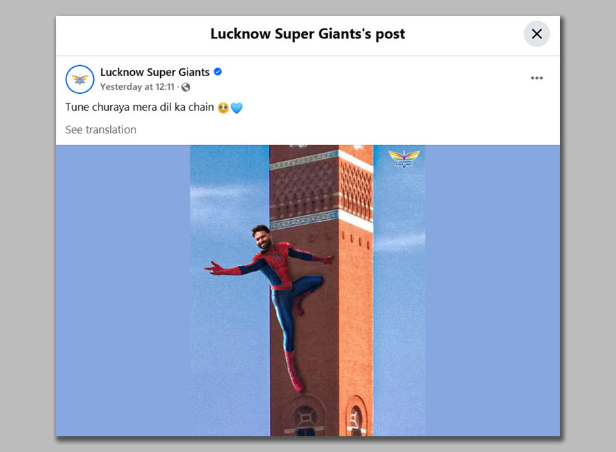 Lucknow Super Giants turned their record-breaking Rs 27-crore bid for Rishabh Pant into a Spider-Man spectacular. With great power comes great responsibility... to create viral content! And boy, did they deliver! Their Rishabh Pant announcement reimagined the wicketkeeper-batsman as your friendly neighborhood Spider-Man, complete with web-slinging action across Lucknow's skyline. The cherry on top? They used lyrics of Pant's viral singing clip of the Hindi Spider-Man theme song as caption: "tune churaya mera dil ka chain”.