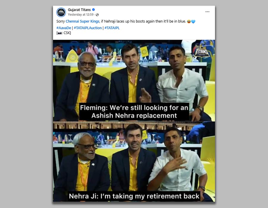 Just when you thought mentor meetings couldn't be entertaining, Gujarat Titans turned a casual conversation between Ashish Nehra and Stephen Fleming into pure social media gold. The candid camera caught Fleming playfully threatening to replace Nehra, leading to our beloved Nehraji dropping the retirement bomb: "I'm taking my retirement back!" GT's caption "If Nehraji laces up again, it'll be in blue" had fans imagining the return of those legendary facial expressions and unique bowling actions. The post wasn't just funny – it was a masterclass in turning behind-the-scenes moments into viral content. Nehra's meme potential remains undefeated, proving that some legends never retire from entertaining!