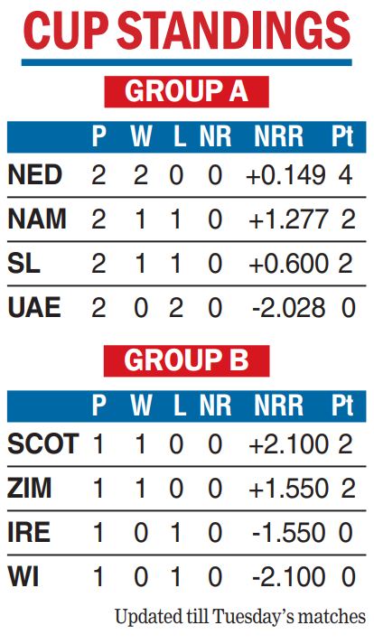 Brief scores: Namibia 121/6 in 20 overs (J. Frylinck 43; B. De Leede 2/18). The Netherlands 122/5 in 19.3 ovs (V. Singh 39, B. de Leede 30 n.o.; JJ Smit 2/24). The Netherlands won by 5 wickets.