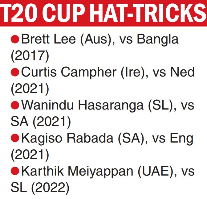 Despite the loss, UAE spinner Karthik Meiyappan got his name up in the record books by becoming the first bowler to claim a hat-trick in this T20 World Cup. Meiyappan, 22, dismissed Bhanuka Rajapaksa, Charith Asalanka and captain Dasun Shanaka in the 15th over of the Lankan innings.