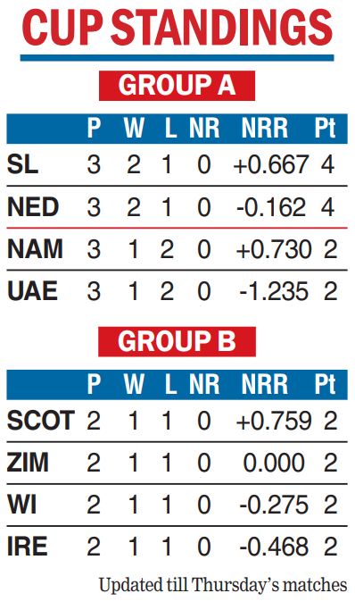 Courtesy UAE’s win, the Netherlands qualified for the Super 12 from Group A, along with Sri Lanka, while Namibia, who were in the reckoning before the match, got eliminated.