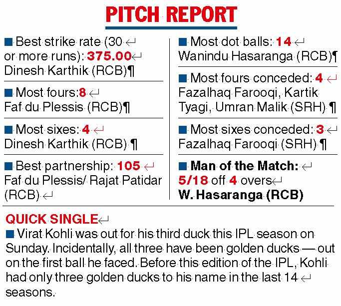 Courtesy their skipper Faf du Plessis’ unbeaten 73 and leg-spinner Wanindu Hasaranga’s 5/18, RCB handed Sunrisers Hyderabad a 67-run thrashing to take their points tally to 14 and ensure they remain among the top four in the standings.